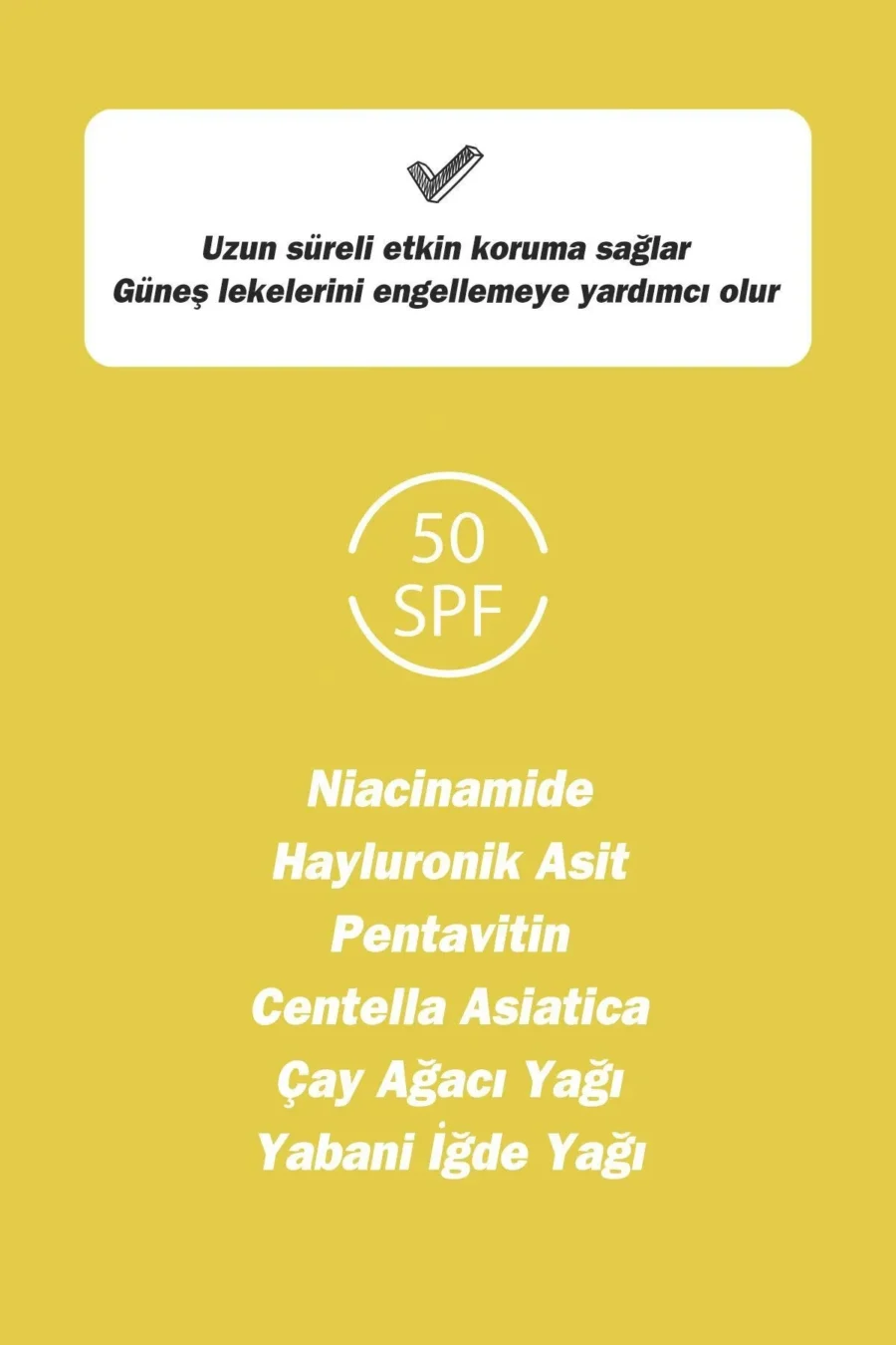 İçeriğinde Niacinamide, Hayluronik Asit, Pentavitin, Centella Asiatica Ekstraktı, Çay Ağacı Yağı ve Yabani İğde Yağı ile formüle edilmiş kozmetik bir üründür. İçeriğinde yer alan UV Filtreler ile cilt yaşlanmasının önemli sebeplerinden olan güneşin zararlı UVA ve UVB ışınlarına karşı cildinizi yüksek derecede korumaya yardımcı olur. Ayrıca; Pentavitin ve Hyaluronik Asit gibi ilave güçlü bileşenler sayesinde cildin ideal nem dengesini koruyarak cilt bariyerinin güçlenmesine katkı sağlar. Niacinamide ve Centella Asiatica Ekstraktı sayesinde, güneş kaynaklı leke oluşumunu önleyerek cilt tonunu eşitlemeye yardımcı olurken içerdiği bitkisel kaynaklı bileşenlerin antioksidan özellikleri ile cildi dış etkenlere karşı korumaya katkı sağlar. Günlük kullanıma uygun bir Güneş Koruyucu Kremdir.