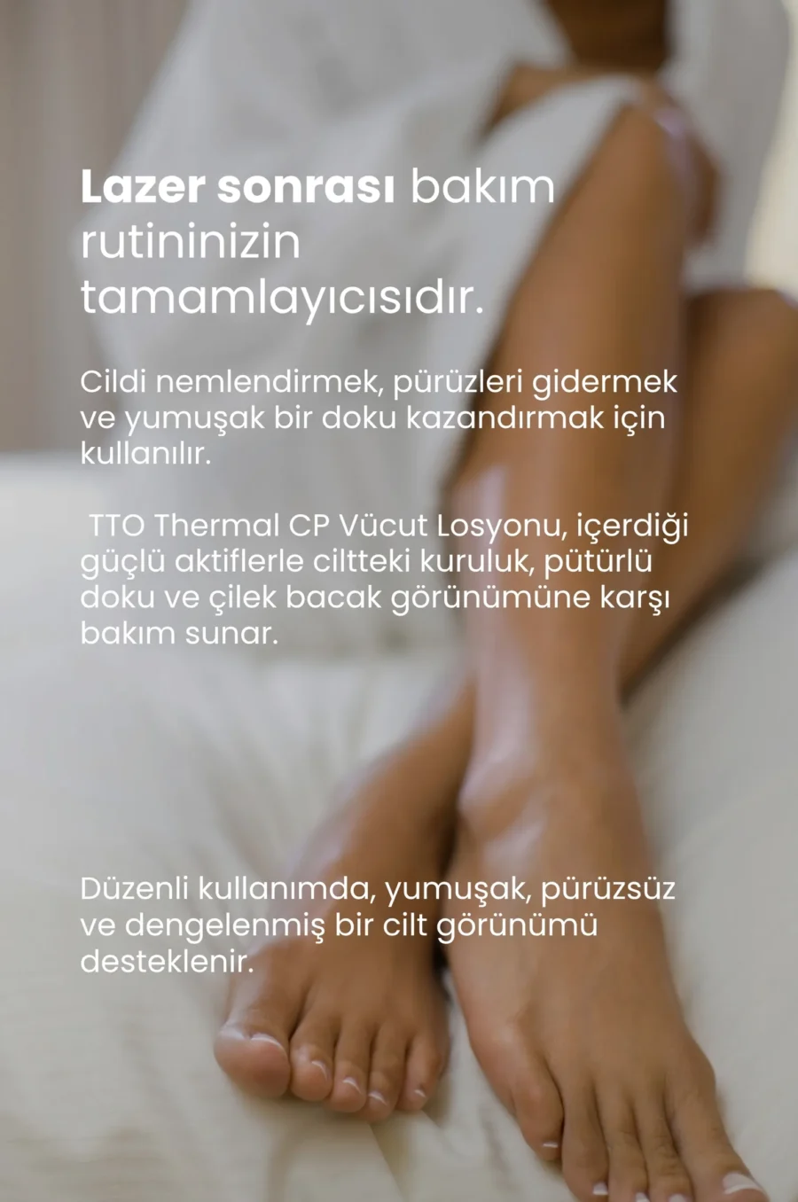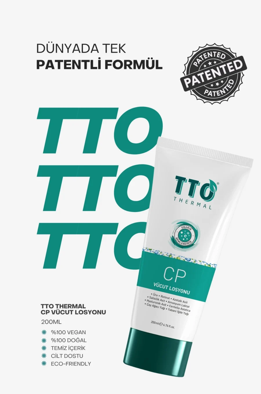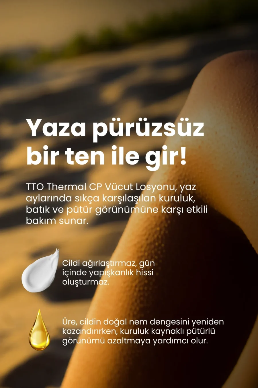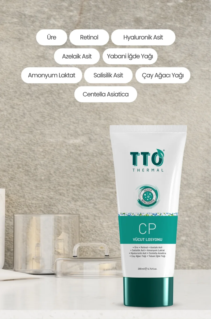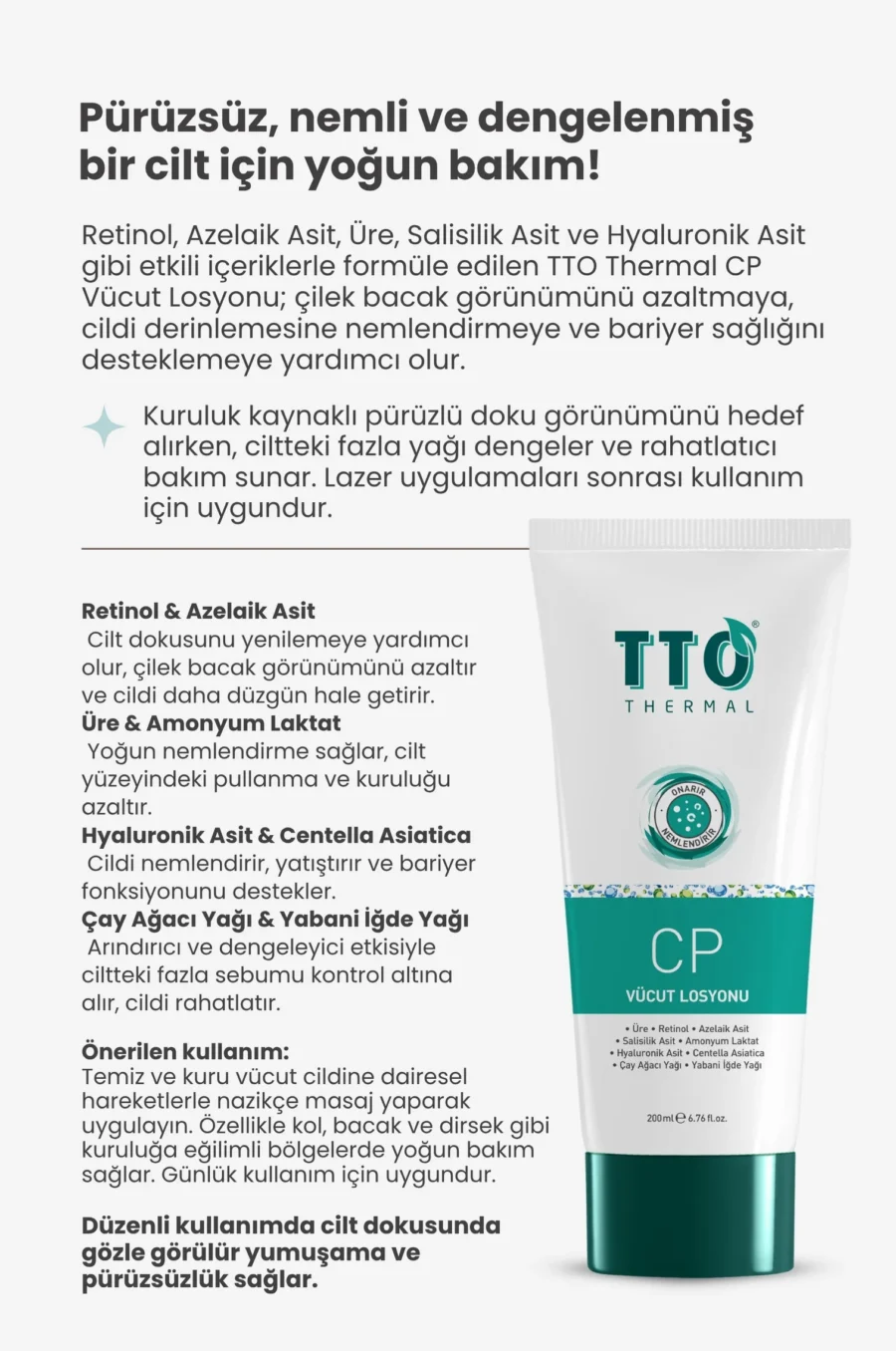 İçeriğinde bulunan Salisilik asit ve Azelaik asit’in güçlü kombinasyonu ile, cilt yüzeyindeki ölü hücreleri nazikçe arındırarak pürüzsüz bir görünüm kazanmasına yardımcı olur. Çay ağacı yağı, Yabani İğde Yağı, Centella Asitaica Ekstresi ve Hyaluronik Asit sayesinde cildinizin nem dengesini korumaya yardımcı olurken, cildinizin elastikiyetini artırarak daha sıkı bir görünüm kazanmasına destek olur. ; Kullanımı:Temiz ve Kuru cildinize yeterli miktarda TTO THERMAL NEMLENDİRİCİ VÜCUT LOSYONU CP alarak, tamamen emilene kadar nazikçe uygulayınız. ; İçindekiler:Aqua, Glycerin, Caprylic/Capric triglyceride, Cetearyl Alcohol, Ceteareth-25, Dimethicone, Polysorbate 80, Carbomer, Allantoin, Propylene Glycol, Melaleuca Alternifolia Leaf Oil, Hippophae Rhamnoides Oil, Sodium Hyaluronate, Centella Asiatica Extract, Tocopherol, Retinol, Urea, Disodium EDTA, Ammonium Lactate, Xanthan Gum, Phenoxyethanol, Ethylhexylglycerin, Salicylic Acid, Azelaic acid, Triethanolamine.