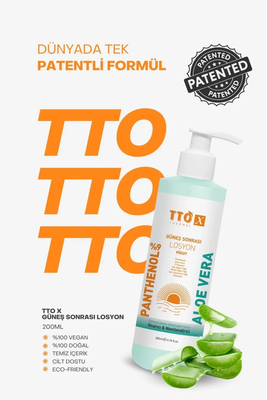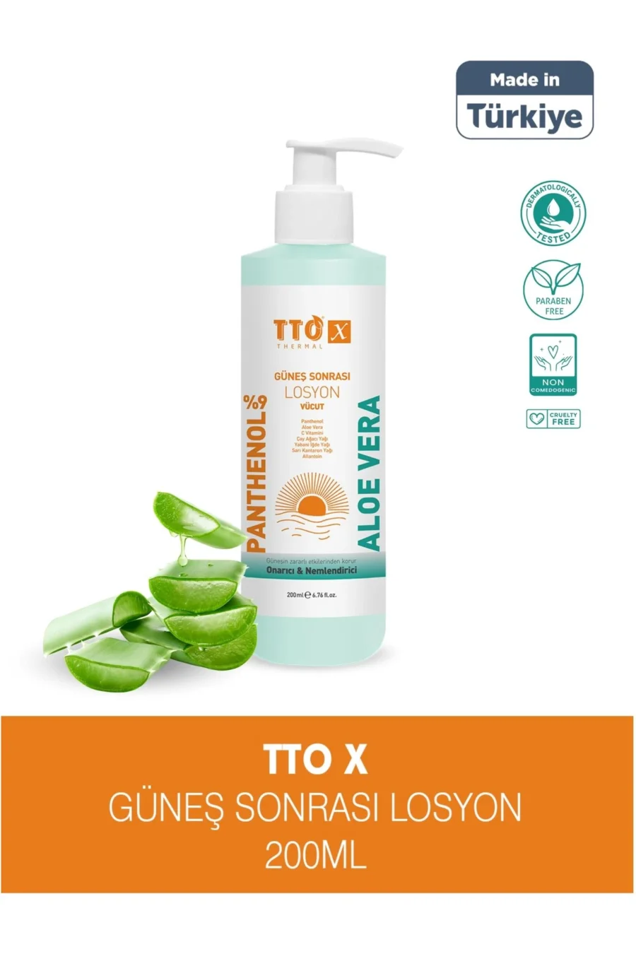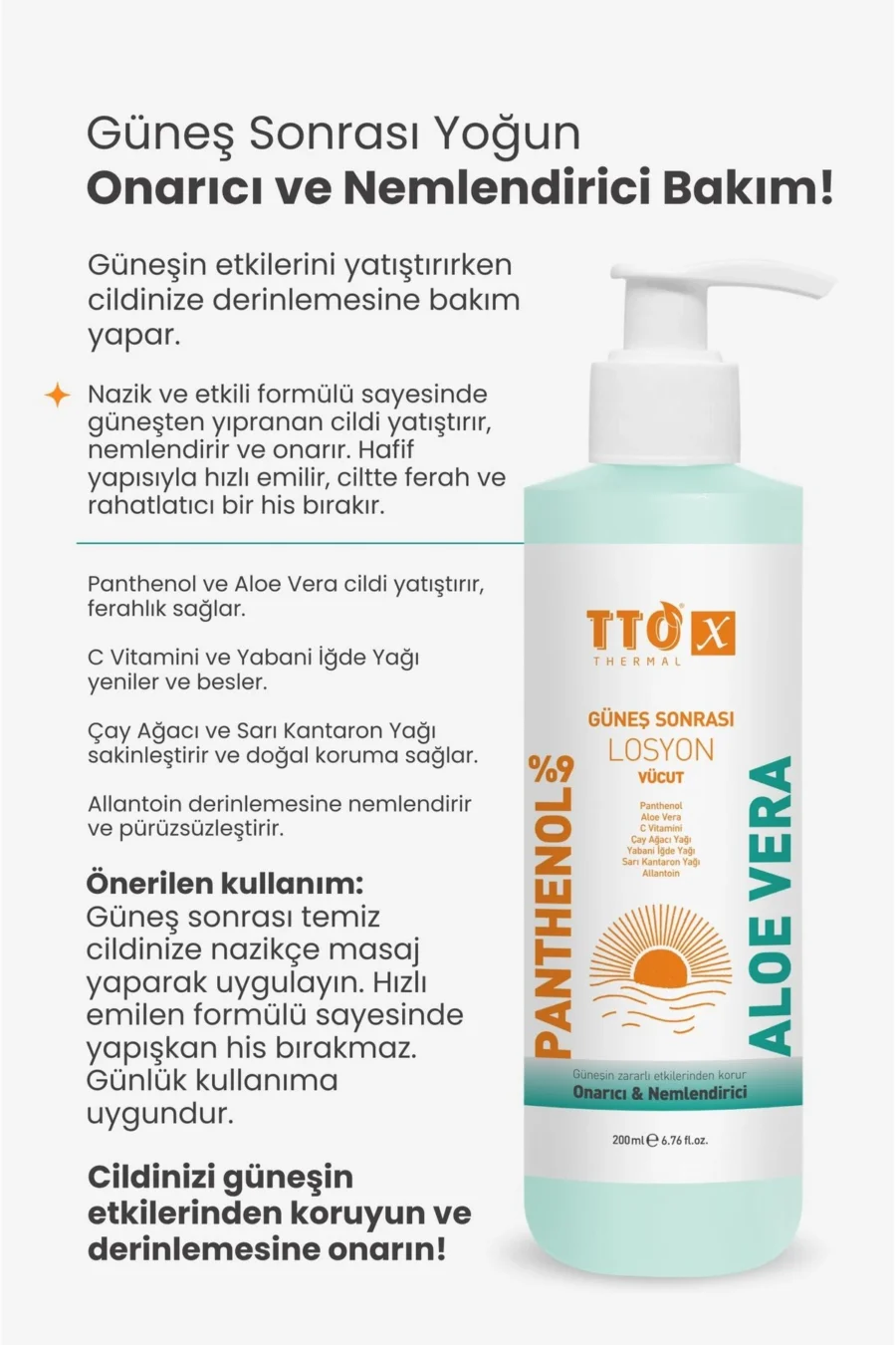 TTO-X GÜNEŞ SONRASI VÜCUT LOSYONU Cildinizi güneşin zararlı etkilerinden koruyarak nemlendirir. İçeriğindeki Aloe Vera, C Vitamini, Yabani İğde Yağı ve Sarı Kantaron Yağı ile cildinize ihtiyacı olan bakımı sağlar, cilt bariyerini güçlendirir. Ayrıca, Panthenol ve Allantoin gibi bileşenler, cildin yumuşamasını ve pürüzsüz bir görünüm kazanmasına yardımcı olur. Cildinize güneş sonrası yumuşak bir his sunar. KULLANIM ŞEKLİ: Güneşe maruz kaldıktan sonra, cildinizin temiz ve kuru olduğundan emin olun. Losyonu avuç içinize alın ve nazikçe cildinize masaj yaparak uygulayın. Özellikle güneşten etkilenmiş bölgelere (yüz, kollar, bacaklar) yoğunlaşarak kullanabilirsiniz. Cilt tarafından tamamen emilene kadar ürünü uygulamaya devam edin. Güneş sonrası cildinizi rahatlatmak için ihtiyaca göre gün boyu kullanabilirsiniz. UYARILAR: Yalnızca harici kullanım içindir. Göz ile temastan kaçının. Gözle teması durumunda bol su ile yıkayın. İçeriğindeki yağlar alerjik reaksiyona sebep olabilir. Ciltte herhangi bir tahriş veya alerjik reaksiyon görüldüğünde kullanımı durdurun ve bir uzmana danışın. Çocukların ulaşamayacağı bir yerde saklayınız. Cildinizin güneşe maruz kaldığı süreyi kısıtlamak için, düzenli olarak güneş koruyucu ürünler kullanın. Oda sıcaklığında saklayınız